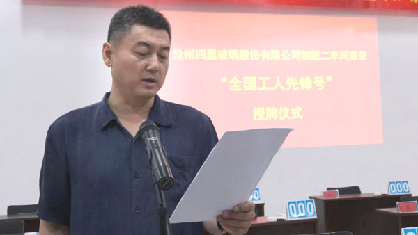 6月29日上午,滄縣總工會(huì)在滄州四星玻璃股份有限公司舉行“全國(guó)工人先鋒號(hào)”授牌儀式,為榮獲“全國(guó)工人先鋒號(hào)”的滄州四星玻璃股份有限公司制瓶二車間頒發(fā)表彰授牌,滄縣人大常委會(huì)副主任、總工會(huì)主席徐澤林,滄縣總工會(huì)黨組書記、常務(wù)副主席趙洪濤,中共滄縣縣委組織部副部長(zhǎng)、兩新工委書記李金峰,滄州市總工會(huì)組織部副部長(zhǎng)王超,紙房頭鎮(zhèn)黨委書記許勇,紙房頭鎮(zhèn)人大主席何玉利,紙房頭鎮(zhèn)人大副主席呂增煥,滄州四星玻璃股份有限公司董事長(zhǎng)王煥一參加了授牌儀式。
