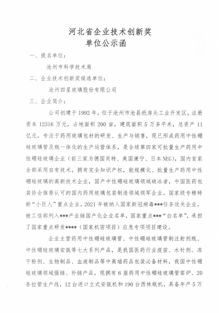 河北省企業(yè)技術創(chuàng)新獎單位公示函